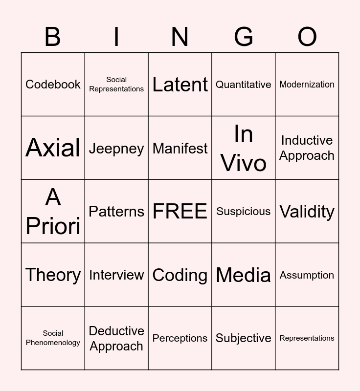 This bingo card has a free space and 33 words: Thematic Analysis, Qualitative, Patterns, Themes, Theory, Jeepney, Modernization, Social Phenomenology, Social Representations, Social Reality, Manifest, Latent, Explicit, Emphatic, Suspicious, Inductive Approach, Deductive Approach, A Priori, Interview, Media, Coding, Good Code, Codebook, Validity, Perceptions, Representations, Quantitative, In Vivo, Axial, Assumption, Beliefs, Subjective and Objective.
