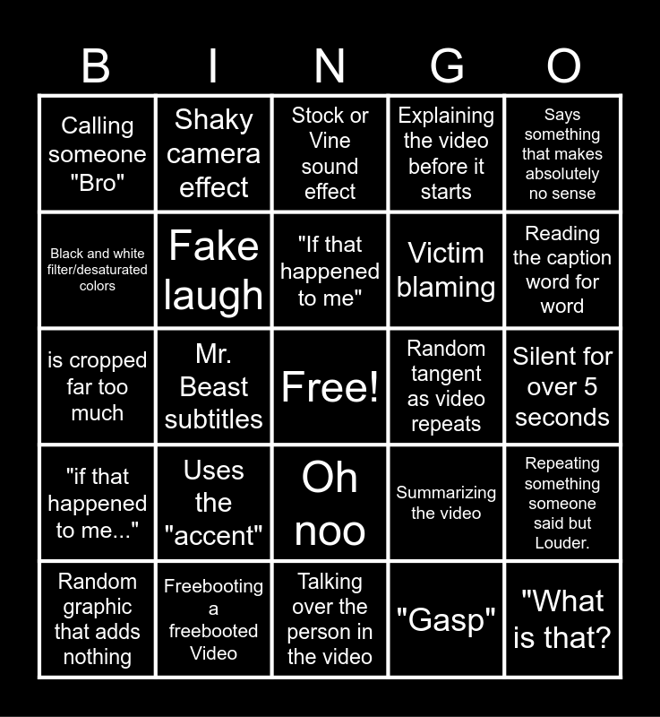 This bingo card has a free space and 24 words: Uses the "accent", Freebooting a freebooted Video, "If that happened to me", Random graphic that adds nothing, Says something that makes absolutely no sense, Calling someone "Bro", Black and white filter/desaturated colors, Shaky camera effect, Random tangent as video repeats, Oh noo, Victim blaming, is cropped far too much, Summarizing the video, Repeating something someone said but Louder., Fake laugh, "Gasp", Silent for over 5 seconds, Stock or Vine sound effect, Reading the caption word for word, Mr. Beast subtitles, "What is that?, "if that happened to me...", Explaining the video before it starts and Talking over the person in the video.