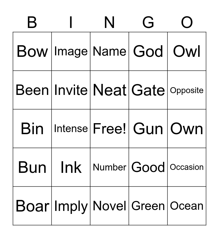 This bingo card has a free space and 24 words: Boar, Ink, Neat, Green, Owl, Bow, Image, Name, Gun, Own, Bin, Invite, Good, Occasion, Been, Imply, Novel, God, Opposite, Bun, Intense, Number, Gate and Ocean.