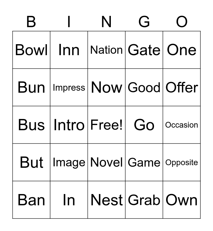 This bingo card has a free space and 24 words: Ban, Image, Now, Grab, One, Bowl, Inn, Nation, Go, Occasion, Bus, Impress, Game, Opposite, Bun, In, Nest, Gate, Offer, But, Intro, Novel, Good and Own.