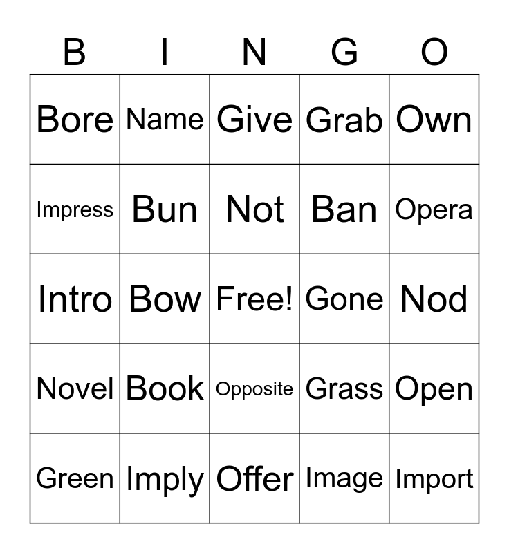 This bingo card has a free space and 24 words: Book, Imply, Not, Green, Own, Bore, Impress, Name, Gone, Opposite, Ban, Intro, Grass, Open, Bun, Image, Nod, Give, Opera, Bow, Import, Novel, Grab and Offer.