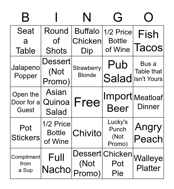This bingo card has a free space and 24 words: 1/2 Price Bottle of Wine, Full Nacho, Strawberry Blonde, Compliment from a Sup, Fish Tacos, Seat a Table, Jalapeno Popper, Round of Shots, Import Beer, Chivito, Pub Salad, Open the Door for a Guest, Lucky's Punch (Not Promo), Angry Peach, Dessert (Not Promo), Chicken Pot Pie, Meatloaf Dinner, Buffalo Chicken Dip, Bus a Table that Isn't Yours, Asian Quinoa Salad, Walleye Platter, Pot Stickers, 1/2 Price Bottle of Wine and Dessert (Not Promo).