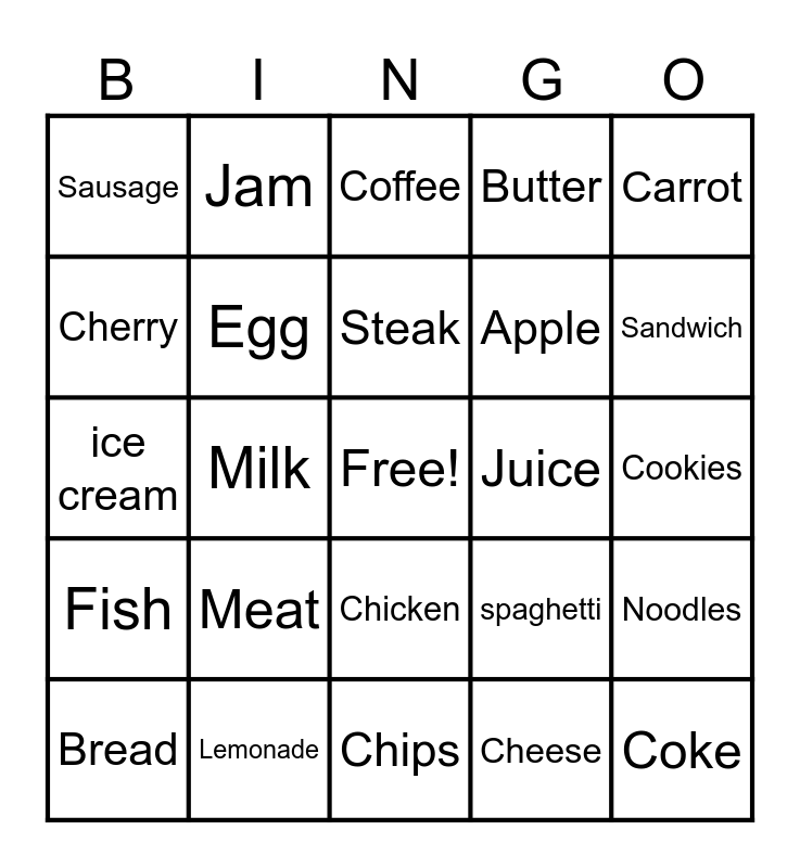 This bingo card has a free space and 29 words: Bread, Tea, Milk, Burger, Sausage, Coffee, Egg, Meat, Juice, Lemonade, Cookies, Coke, Chips, Cheese, Sandwich, Rice, Chicken, Fish, Carrot, ice cream, spaghetti, Water, Apple, Cherry, Butter, Jam, Noodles, Steak and Cake.
