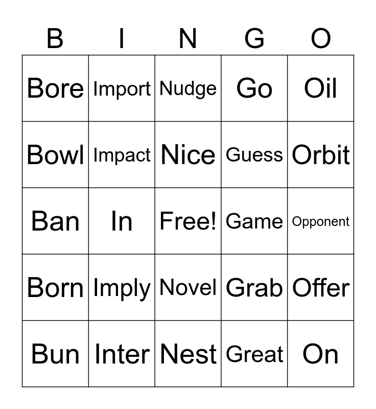 This bingo card has a free space and 24 words: Bun, Imply, Nice, Great, Oil, Bore, Import, Nudge, Game, Opponent, Ban, Impact, Grab, Offer, Bowl, Inter, Nest, Go, Orbit, Born, In, Novel, Guess and On.
