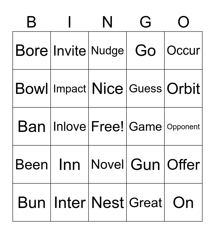 This bingo card has a free space and 24 words: Bun, Inn, Nice, Great, Occur, Bore, Invite, Nudge, Game, Opponent, Ban, Impact, Gun, Offer, Bowl, Inter, Nest, Go, Orbit, Been, Inlove, Novel, Guess and On.