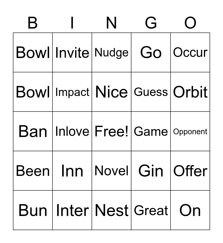This bingo card has a free space and 24 words: Bun, Inn, Nice, Great, Occur, Bowl, Invite, Nudge, Game, Opponent, Ban, Impact, Gin, Offer, Bowl, Inter, Nest, Go, Orbit, Been, Inlove, Novel, Guess and On.