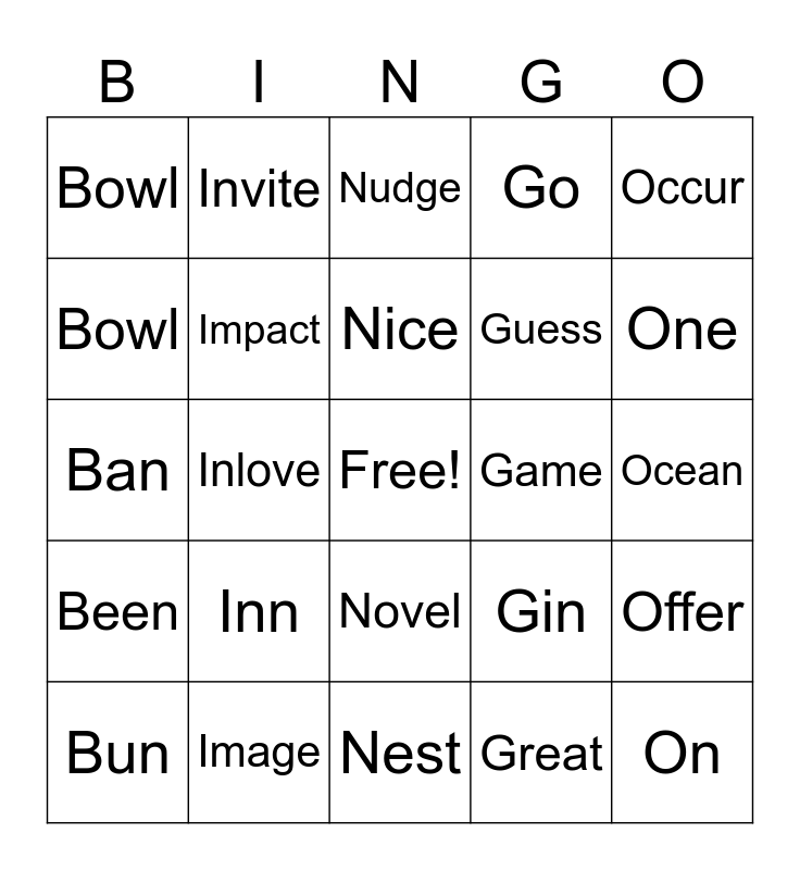 This bingo card has a free space and 24 words: Bun, Inn, Nice, Great, Occur, Bowl, Invite, Nudge, Game, Ocean, Ban, Impact, Gin, Offer, Bowl, Image, Nest, Go, One, Been, Inlove, Novel, Guess and On.