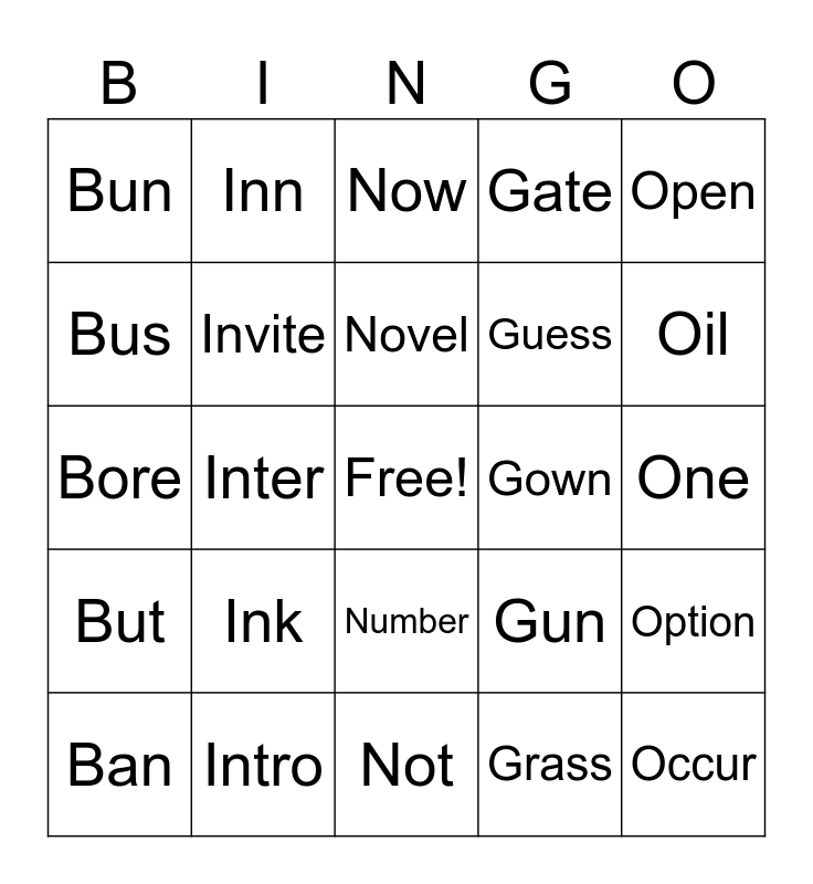This bingo card has a free space and 24 words: Ban, Ink, Novel, Grass, Open, Bun, Inn, Now, Gown, One, Bore, Invite, Gun, Option, Bus, Intro, Not, Gate, Oil, But, Inter, Number, Guess and Occur.