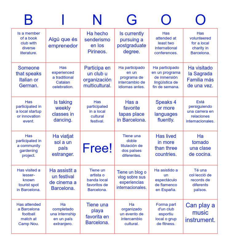 This bingo card has 36 words: Has participated in a community gardening project., Ha viatjat sol a un país estranger., Tiene una playa favorita en Barcelona., Ha participado en un programa de intercambio de idiomas antes., Speaks 4 or more languages fluently., Está persiguiendo una carrera en relaciones internacionales., Is a member of a book club with diverse literature., Ha completado una internship en un país extranjero., Ha hecho senderismo en los Pirineos., Tiene un blog o vlog sobre sus experiencias internacionales., Ha participado en un programa de inmersión lingüística de fin de semana., Has volunteered for a local charity in Barcelona., Has visited a lesser-known tourist spot in Barcelona., Is taking weekly classes in dancing., Participa en un club u organización multicultural., Is currently pursuing a postgraduate degree., Ha asistido a un espectáculo de flamenco en España., Ha tomado una clase de cocina., Someone that speaks Italian or German., Has experienced a traditional Catalan celebration., Free!, Tiene una doble titulación de dos países diferentes., Has lived in more than three countries., Té una col·lecció de records de diferents països., Has participated in a local startup or innovation event., Algú que és emprenedor, Has participated in a local cultural festival., Ha organizado un evento de intercambio cultural., Has attended at least two international conferences., Ha visitado la Sagrada Familia más de una vez., Has attended a Barcelona football match at Camp Nou., Ha assistit a un festival de cinema a Barcelona., Tiene un artista o banda local favoritos de Barcelona., Has a favorite tapas place in Barcelona., Forma part d'un club esportiu local o grup de fitness. and Can play a music instrument..