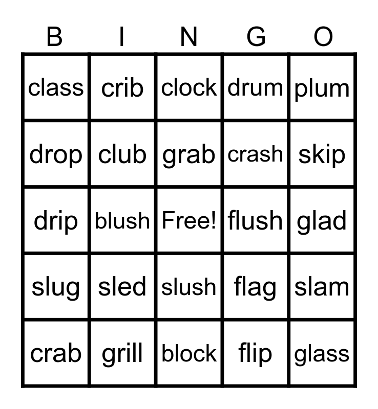 This bingo card has a free space and 31 words: block, blab, blush, clam, class, clock, club, flag, flush, flip, glad, glass, glob, skim, skip, skill, slam, sled, slug, slush, plum, plan, crab, crib, crash, drop, drum, drip, grill, grab and grin.