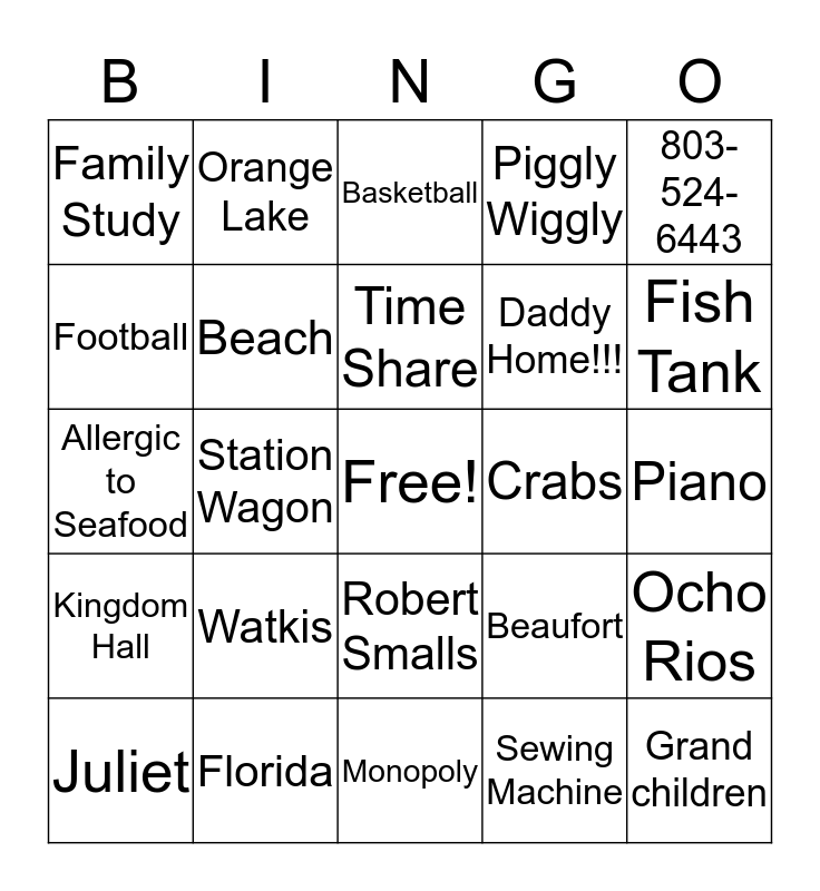 This bingo card has a free space and 24 words: Watkis, Florida, Time Share, Juliet, 803-524-6443, Family Study, Football, Orange Lake, Crabs, Robert Smalls, Daddy Home!!!, Allergic to Seafood, Beaufort, Ocho Rios, Beach, Sewing Machine, Piano, Basketball, Fish Tank, Station Wagon, Grand children, Kingdom Hall, Piggly Wiggly and Monopoly.
