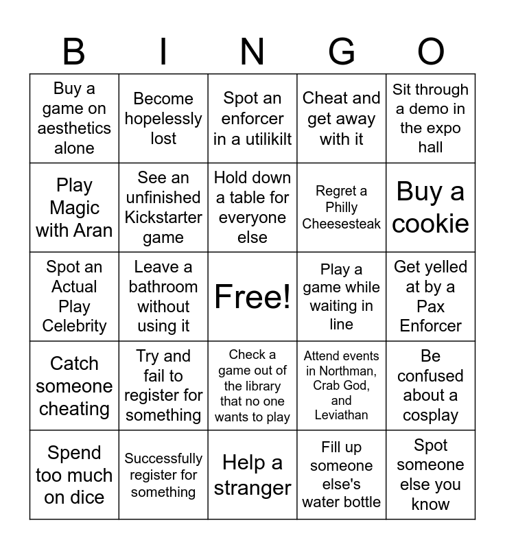 This bingo card has a free space and 24 words: Try and fail to register for something, Successfully register for something, Hold down a table for everyone else, Spend too much on dice, Sit through a demo in the expo hall, Buy a game on aesthetics alone, Play Magic with Aran, Become hopelessly lost, Play a game while waiting in line, Check a game out of the library that no one wants to play, Regret a Philly Cheesesteak, Spot an Actual Play Celebrity, Attend events in Northman, Crab God, and Leviathan, Be confused about a cosplay, See an unfinished Kickstarter game, Fill up someone else's water bottle, Get yelled at by a Pax Enforcer, Spot an enforcer in a utilikilt, Buy a cookie, Leave a bathroom without using it, Spot someone else you know, Catch someone cheating, Cheat and get away with it and Help a stranger.