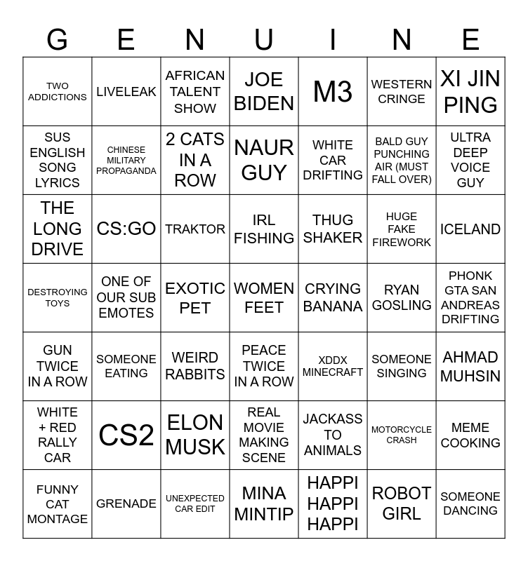This bingo card has a free space and 48 words: JACKASS TO ANIMALS, BALD GUY PUNCHING AIR (MUST FALL OVER), MINA MINTIP, ONE OF OUR SUB EMOTES, TRAKTOR, PHONK GTA SAN ANDREAS DRIFTING, LIVELEAK, GRENADE, WESTERN CRINGE, PEACE TWICE IN A ROW, XI JIN PING, JOE BIDEN, HUGE FAKE FIREWORK, THUG SHAKER, WHITE + RED RALLY CAR, RYAN GOSLING, SUS ENGLISH SONG LYRICS, ULTRA DEEP VOICE GUY, MOTORCYCLE CRASH, M3, WHITE CAR DRIFTING, EXOTIC PET, TWO ADDICTIONS, CHINESE MILITARY PROPAGANDA, MEME COOKING, 2 CATS IN A ROW, ICELAND, FUNNY CAT MONTAGE, IRL FISHING, CS:GO, ROBOT GIRL, CRYING BANANA, AHMAD MUHSIN, CS2, DESTROYING TOYS, XDDX MINECRAFT, SOMEONE SINGING, THE LONG DRIVE, WEIRD RABBITS, ELON MUSK, GUN TWICE IN A ROW, SOMEONE DANCING, AFRICAN TALENT SHOW, UNEXPECTED CAR EDIT, NAUR GUY, REAL MOVIE MAKING SCENE, SOMEONE EATING and HAPPI HAPPI HAPPI.