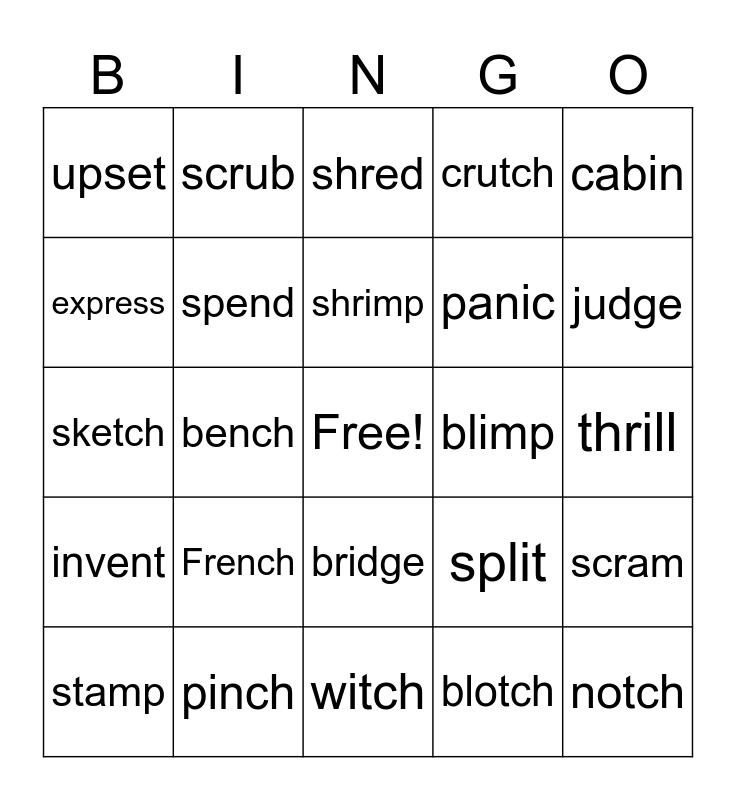 This bingo card has a free space and 29 words: stamp, grin, bench, brunch, upset, shred, spend, French, blimp, pinch, thrill, notch, witch, blotch, judge, tennis, bridge, invent, cabin, sketch, split, epic, panic, express, crutch, scrub, scram, shrimp and bedbug.