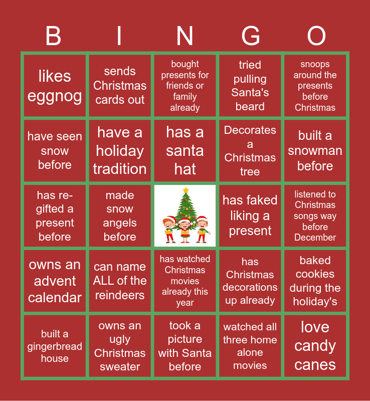 This bingo card has a free space and 24 words: can name ALL of the reindeers, owns an ugly Christmas sweater, has a santa hat, built a gingerbread house, snoops around the presents before Christmas, likes eggnog, have seen snow before, sends Christmas cards out, has faked liking a present, has watched Christmas movies already this year, Decorates a Christmas tree, has re-gifted a present before, has Christmas decorations up already, baked cookies during the holiday's, have a holiday tradition, watched all three home alone movies, listened to Christmas songs way before December, bought presents for friends or family already, built a snowman before, made snow angels before, love candy canes, owns an advent calendar, tried pulling Santa's beard and took a picture with Santa before.