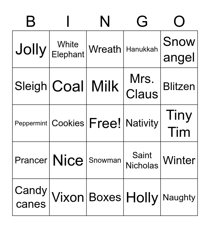 This bingo card has a free space and 114 words: Christmas, Tree, Dreidel, Reindeer, Gift, Stocking, Hanukkah, Eggnog, Joy, Rudolph, Mistletoe, Ornaments, Peace, Snow, Yuletide, Frosty, Snowman, Merry, Candles, Kwanzaa, Candy canes, Wreath, North Pole, Dasher, Dancer, Prancer, Vixon, Comet, Cupid, Donner, Blitzen, Milk, Cookies, Bells, December, Family, Star, Gingerbread, Holidays, Decorations, Nutcracker, Gift wrap, Caroling, Scrooge, Santa Claus, Tinsel, Holly, Sleigh, Red nose, Festive, Advent, Nativity, Noel, Elves, Feliz Navidad, Jingle bells, Christmas Eve, Boxing Day, Christmas cards, Ho, ho, ho, Winter, Bows, Grinch, Hot chocolate, Jack Frost, Kris Kringle, Manger, Coal, Peppermint, Sweater, Tiny Tim, Wise men, Winter Wonderland, Toys, Partridge, Naughty, Nice, Jolly, Gingerbread house, Chestnut, Advent calendar, White Elephant, White Christmas, Saint Nicholas, Mrs. Claus, Carol, Cheerful, Evergreen, Fruitcake, Buddy the Elf, Krampus, Mittens, Secret Santa, Snow angel, Sugarplum, Workshop, Wrapping paper, Xmas, Pinecone, Santa's helpers, December 25, Chimney, Fireplace, Goodwill, Myrrh, Stocking stuffer, Together, Boxes, Elf on the Shelf, Menorah, Star of David, Gum drops, Scarf and Santa hat.