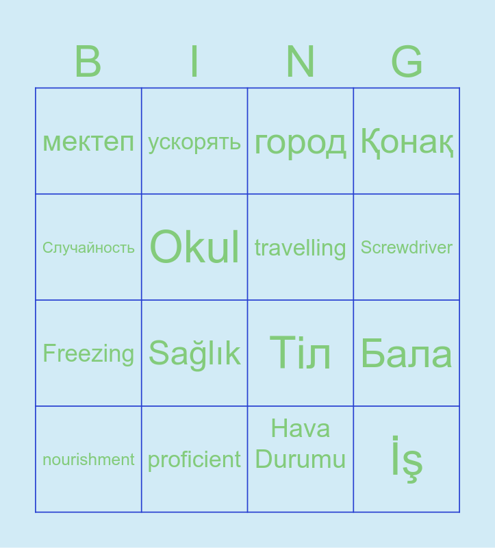 This bingo card has 16 words: proficient, Бала, город, мектеп, Freezing, ускорять, Тіл, Hava Durumu, Случайность, Okul, nourishment, Қонақ, Sağlık, Screwdriver, travelling and İş.