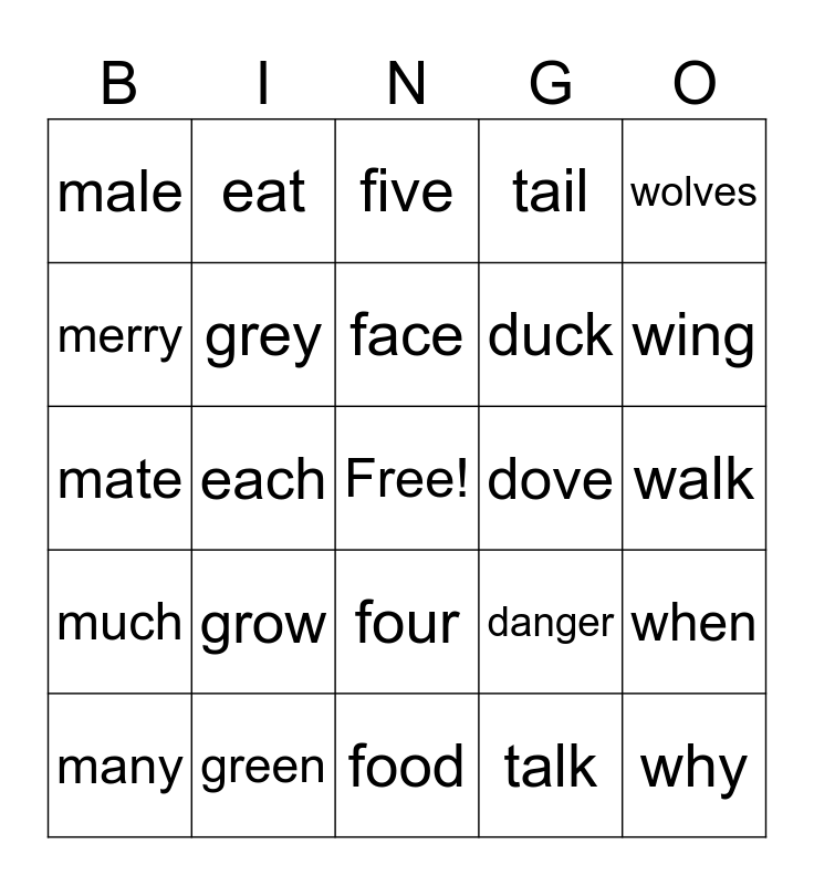 This bingo card has a free space and 24 words: many, grow, face, talk, wolves, male, eat, five, dove, walk, mate, grey, danger, when, merry, green, food, tail, wing, much, each, four, duck and why.