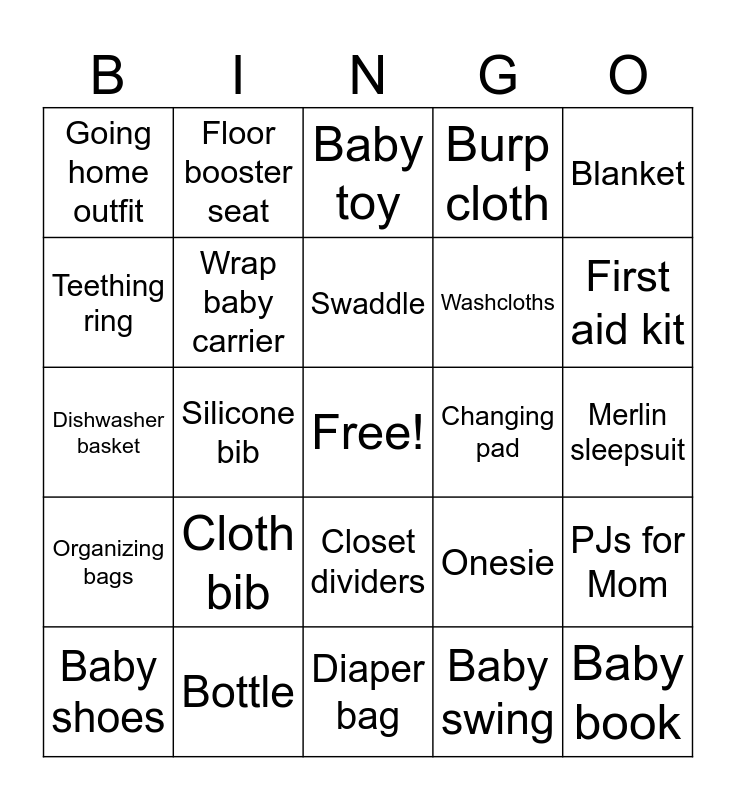 This bingo card has a free space and 45 words: 5-in-1 Cover, Baby book, Baby lotion, Baby shoes, Baby socks, Baby swing, Baby toy, Baby wipes, Blanket, Bottle, Burp cloth, Changing pad, Closet dividers, Cloth bib, Crib sheets, Diaper bag, Diapers, Dishwasher basket, Electric nail file, First aid kit, Floor booster seat, Fox lovey, Sophie the giraffe, Going home outfit, Humidifier, Merlin sleepsuit, Mobile, Newborn gown, Onesie, Organizing bags, Pacifier, PJs for Mom, Playmat/ Baby gym, Rattle, Silicone bib, Silicone bib, Sleep machine/ Nightlight, Stroller, Stroller organizer, Swaddle, Teething ring, Washcloths, Wipes dispenser, Wrap baby carrier and Zipper bags/ pouches.