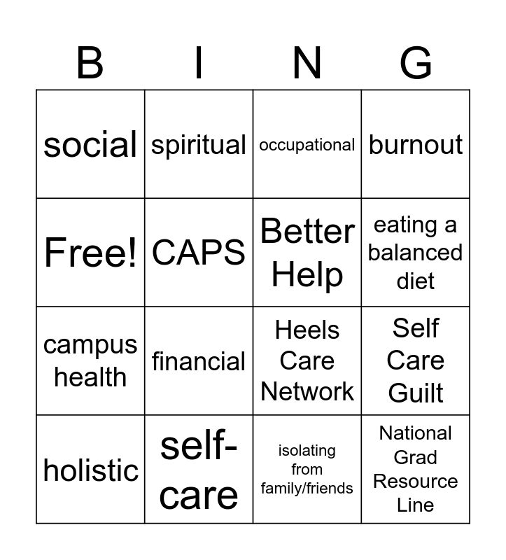 This bingo card has 16 words: self-care, Self Care Guilt, occupational, social, campus health, spiritual, Heels Care Network, isolating from family/friends, Free!, CAPS, holistic, burnout, financial, eating a balanced diet, Better Help and National Grad Resource Line.