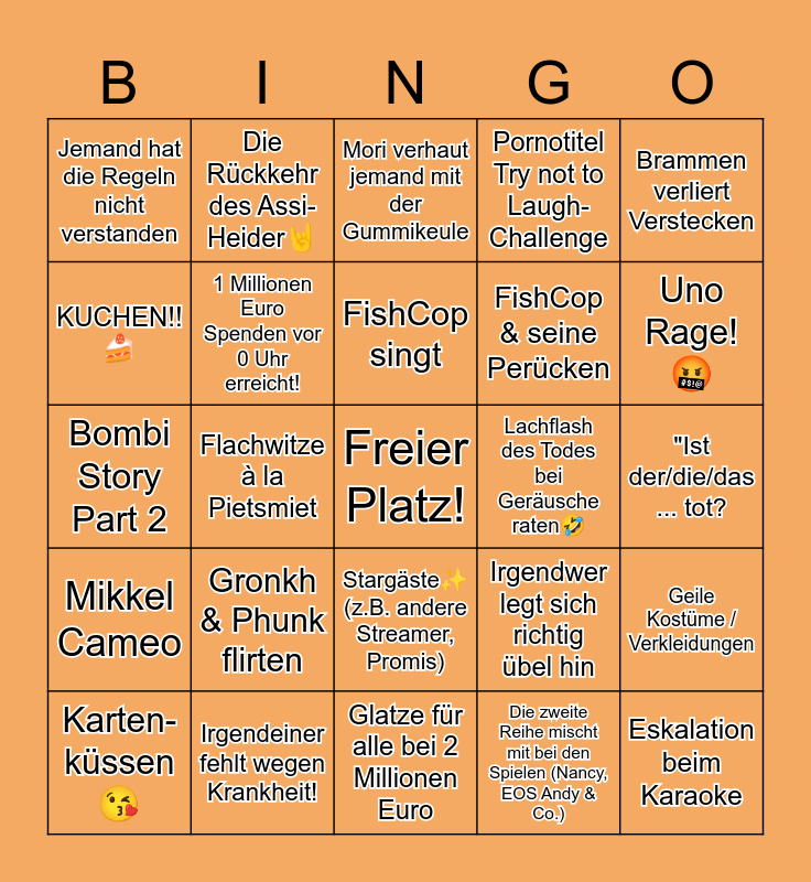 This bingo card has a free space and 24 words: Gronkh & Phunk flirten, Irgendeiner fehlt wegen Krankheit!, FishCop singt, Karten-küssen😘, Brammen verliert Verstecken, Jemand hat die Regeln nicht verstanden, KUCHEN!!🍰, Die Rückkehr des Assi-Heider🤘, Lachflash des Todes bei Geräusche raten🤣, Stargäste✨ (z.B. andere Streamer, Promis), FishCop & seine Perücken, Bombi Story Part 2, Irgendwer legt sich richtig übel hin, Geile Kostüme / Verkleidungen, 1 Millionen Euro Spenden vor 0 Uhr erreicht!, Die zweite Reihe mischt mit bei den Spielen (Nancy, EOS Andy & Co.), "Ist der/die/das ... tot?, Mori verhaut jemand mit der Gummikeule, Uno Rage!🤬, Flachwitze à la Pietsmiet, Eskalation beim Karaoke, Mikkel Cameo, Pornotitel Try not to Laugh-Challenge and Glatze für alle bei 2 Millionen Euro.