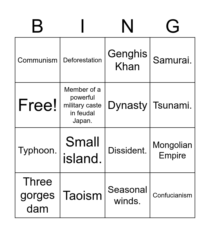 This bingo card has 16 words: Taoism, Mongolian Empire, Genghis Khan, Communism, Typhoon., Deforestation, Dissident., Seasonal winds., Free!, Member of a powerful military caste in feudal Japan., Three gorges dam, Samurai., Small island., Tsunami., Dynasty and Confucianism.
