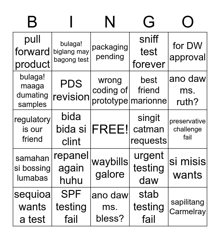 This bingo card has a free space and 24 words: repanel again huhu, SPF testing fail, wrong coding of prototype, sequioa wants a test, for DW approval, pull forward product, bulaga! maaga dumating samples, bulaga! biglang may bagong test, singit catman requests, waybills galore, best friend marionne, regulatory is our friend, urgent testing daw, si misis wants, PDS revision, stab testing fail, preservative challenge fail, packaging pending, ano daw ms. ruth?, bida bida si clint, sapilitang Carmelray, samahan si bossing lumabas, sniff test forever and ano daw ms. bless?.