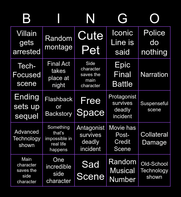 This bingo card has a free space and 24 words: Something that's impossible in real life happens, One incredible side character, Side character saves the main character, Main character saves the side character, Police do nothing, Villain gets arrested, Tech-Focused scene, Random montage, Protagonist survives deadly incident, Antagonist survives deadly incident, Epic Final Battle, Ending sets up sequel, Movie has Post-Credit Scene, Collateral Damage, Final Act takes place at night, Random Musical Number, Suspenseful scene, Cute Pet, Narration, Flashback or Backstory, Old-School Technology shown, Advanced Technology shown, Iconic Line is said and Sad Scene.