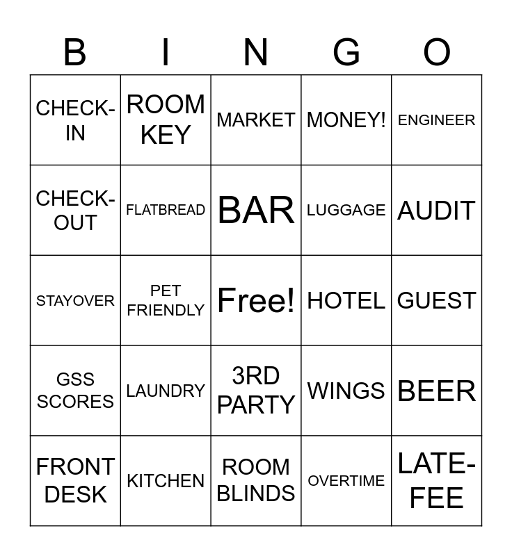 This bingo card has a free space and 24 words: LAUNDRY, KITCHEN, BAR, FRONT DESK, ENGINEER, CHECK-IN, CHECK-OUT, ROOM KEY, HOTEL, 3RD PARTY, LUGGAGE, STAYOVER, WINGS, BEER, FLATBREAD, OVERTIME, GUEST, MARKET, AUDIT, PET FRIENDLY, LATE-FEE, GSS SCORES, MONEY! and ROOM BLINDS.