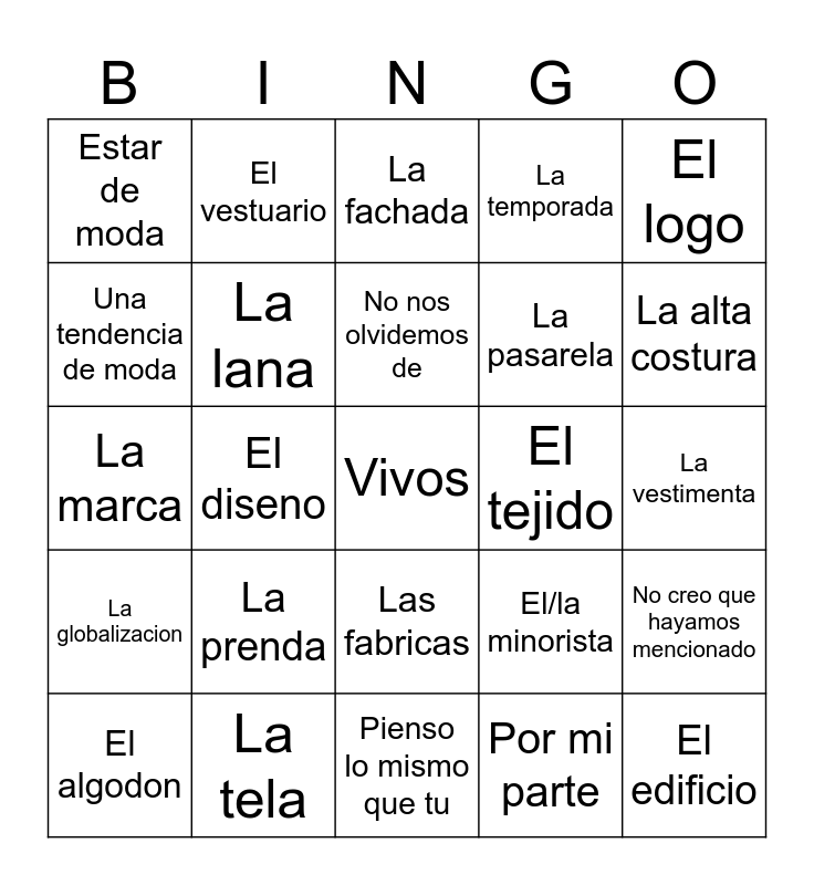BINGO | Bingo | La Moda Y Preferencias | Español 2 - U3L1 | L2 3.1 Vocabulario