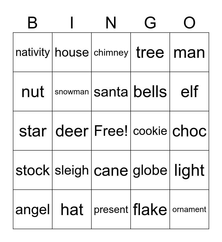 This bingo card has a free space and 24 words: sleigh, hat, santa, angel, man, nativity, nut, house, cookie, cane, bells, star, globe, light, snowman, flake, choc, chimney, elf, deer, ornament, stock, tree and present.