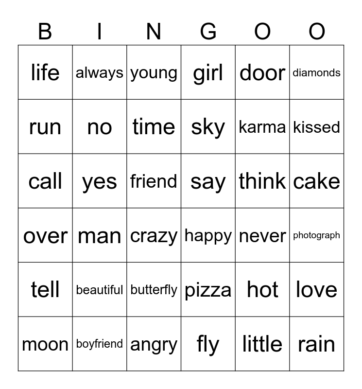 This bingo card has 36 words: pizza, butterfly, fly, run, over, say, no, angry, door, hot, kissed, girl, love, yes, sky, life, tell, think, call, young, friend, man, happy, crazy, never, always, karma, boyfriend, time, diamonds, rain, moon, photograph, cake, beautiful and little.