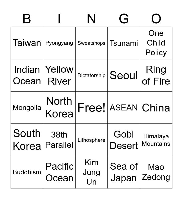 This bingo card has a free space and 24 words: Buddhism, 38th Parallel, Dictatorship, Sea of Japan, One Child Policy, Taiwan, Pyongyang, Sweatshops, ASEAN, China, Mongolia, Yellow River, Gobi Desert, Himalaya Mountains, Indian Ocean, Pacific Ocean, Kim Jung Un, Tsunami, Ring of Fire, South Korea, North Korea, Lithosphere, Seoul and Mao Zedong.