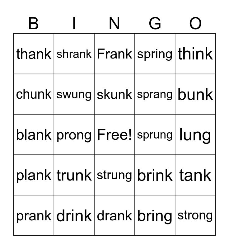 This bingo card has a free space and 24 words: trunk, drink, skunk, prank, think, thank, chunk, shrank, sprung, strung, sprang, blank, brink, tank, swung, bring, lung, Frank, bunk, prong, strong, plank, spring and drank.