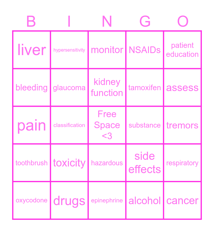 This bingo card has a free space and 24 words: toxicity, drugs, kidney function, oxycodone, patient education, liver, bleeding, hypersensitivity, substance, hazardous, tamoxifen, pain, side effects, respiratory, glaucoma, alcohol, tremors, monitor, assess, classification, cancer, toothbrush, NSAIDs and epinephrine.