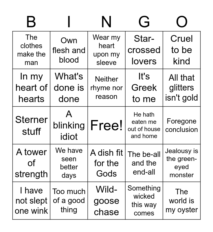 This bingo card has a free space and 24 words: We have seen better days, Too much of a good thing, Neither rhyme nor reason, I have not slept one wink, Cruel to be kind, The clothes make the man, In my heart of hearts, Own flesh and blood, He hath eaten me out of house and home, A dish fit for the Gods, It's Greek to me, Sterner stuff, The be-all and the end-all, Jealousy is the green-eyed monster, What's done is done, Something wicked this way comes, Foregone conclusion, Wear my heart upon my sleeve, All that glitters isn't gold, A blinking idiot, The world is my oyster, A tower of strength, Star-crossed lovers and Wild-goose chase.
