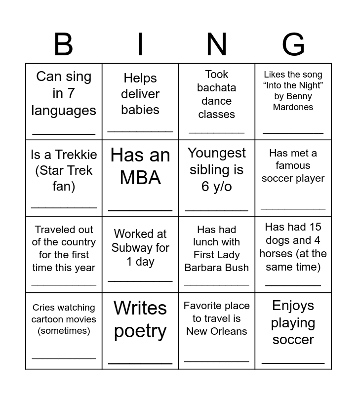 This bingo card has 20 words: Has had 15 dogs and 4 horses (at the same time) _________, Enjoys deep-sea fishing _________, Took bachata dance classes _________, Has a VHS of Air Force One _________, Cries watching cartoon movies (sometimes) ____________, Is a Trekkie (Star Trek fan) _________, Writes poetry ______, Can sing in 7 languages ________, Traveled out of the country for the first time this year ___________, Helps deliver babies _________, Worked at Subway for 1 day __________, Has had lunch with First Lady Barbara Bush ___________, Has an MBA ______, Enjoys playing soccer ________, Youngest sibling is 6 y/o ________, Can do a backflip _________, Has met a famous soccer player ___________, Likes the song “Into the Night” by Benny Mardones ____________, Favorite place to travel is New Orleans ___________ and Is 1 of 5 sisters ________.