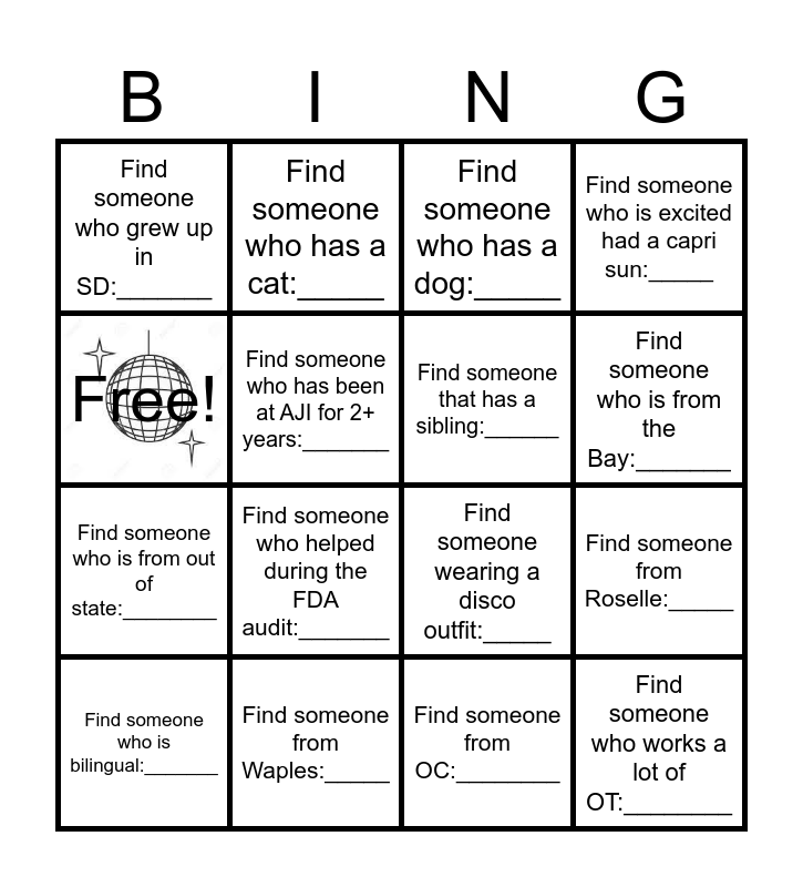 This bingo card has 1 images and 16 words: Find someone from Waples:_____, Find someone from Roselle:_____, Find someone who has a dog:_____, Find someone who grew up in SD:_______, Find someone who is from out of state:________, Find someone who has a cat:_____, Find someone wearing a disco outfit:_____, Find someone from OC:________, Free!, Find someone who has been at AJI for 2+ years:_______, Find someone who is bilingual:_______, Find someone who is excited had a capri sun:_____, Find someone who helped during the FDA audit:_______, Find someone who is from the Bay:_______, Find someone that has a sibling:______ and Find someone who works a lot of OT:________.