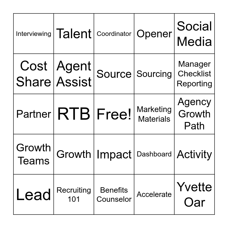 This bingo card has a free space and 53 words: Craig Miller, Yvette Oar, Trey Fender, Accelerate, Growth, 2024, Talent, Recruiting Consultant, Cost Share, Support, Agent Assist, Pipeline, Activity, Dashboard, Territory, Lead, Source, Marketing Materials, Digital Postcard, Social Media, RTB, Planning, Sourcing, Interviewing, Attracting, Recruiting 101, Income Activity Estimator, Manager Onboarding Checklist, TDC, Manager Checklist Reporting, Discovery Process, Lead Advantage, DM Brochure, ADM, DGA, Experiences, Opener, Benefits Counselor, Coordinator, Manager, ASM, CLU, Agency Growth Path, TST Training Calendar, District Development Program, Impact, Premier, Champion, Partner, Growth Teams, Business Investments, Elite ADM and Strategic Catalysts.