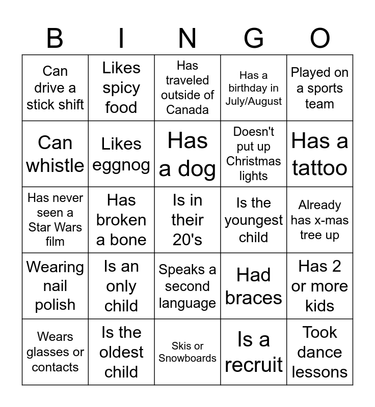 This bingo card has 42 words: Free!, Has a dog, Has a cat, Is an only child, Is a recruit, Has 2 or more kids, Is in their 20's, Plays an instrument, Has traveled outside of Canada, Speaks a second language, Already has x-mas tree up, Has a tattoo, Has broken a bone, Played on a sports team, Has a food allergy, Had braces, Is a lefty, Has never seen a Star Wars film, Has run a 10km or more race, Likes spicy food, Can whistle, Has lived outside of Canada, Took dance lessons, Can drive a stick shift, Listens to podcasts, Been in fire for more than 5 years, Doesn't put up Christmas lights, Opens presents on Christmas Eve, Can name all the reindeer, Watches sports, Watches hallmark movies, Wearing nail polish, Likes eggnog, Skis or Snowboards, Does not have a Facebook account, Wears glasses or contacts, Is the oldest child, Is the youngest child, Has no pets, Wasn't born in Canada, Has a birthday in July/August and Has been skydiving or scuba.