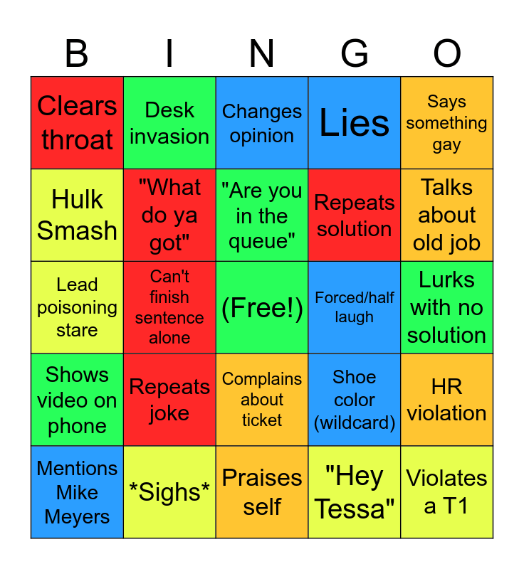 This bingo card has a free space and 24 words: Repeats joke, *Sighs*, "Are you in the queue", Mentions Mike Meyers, Says something gay, Clears throat, Hulk Smash, Desk invasion, Forced/half laugh, Complains about ticket, Repeats solution, Lead poisoning stare, Shoe color (wildcard), HR violation, "What do ya got", "Hey Tessa", Lurks with no solution, Changes opinion, Talks about old job, Can't finish sentence alone, Violates a T1, Shows video on phone, Lies and Praises self.