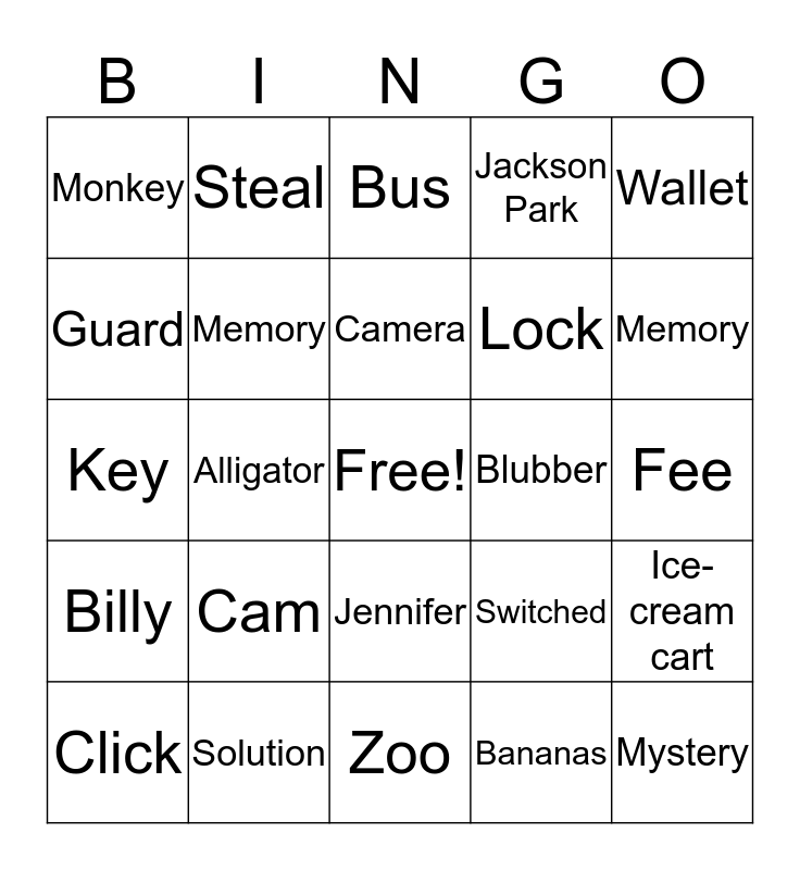 This bingo card has a free space and 25 words: Cam, Zoo, Camera, Click, Wallet, Monkey, Guard, Steal, Blubber, Jennifer, Lock, Key, Switched, Ice-cream cart, Memory, Giraffe, Fee, Bus, Memory, Alligator, Mystery, Solution, Billy, Jackson Park and Bananas.
