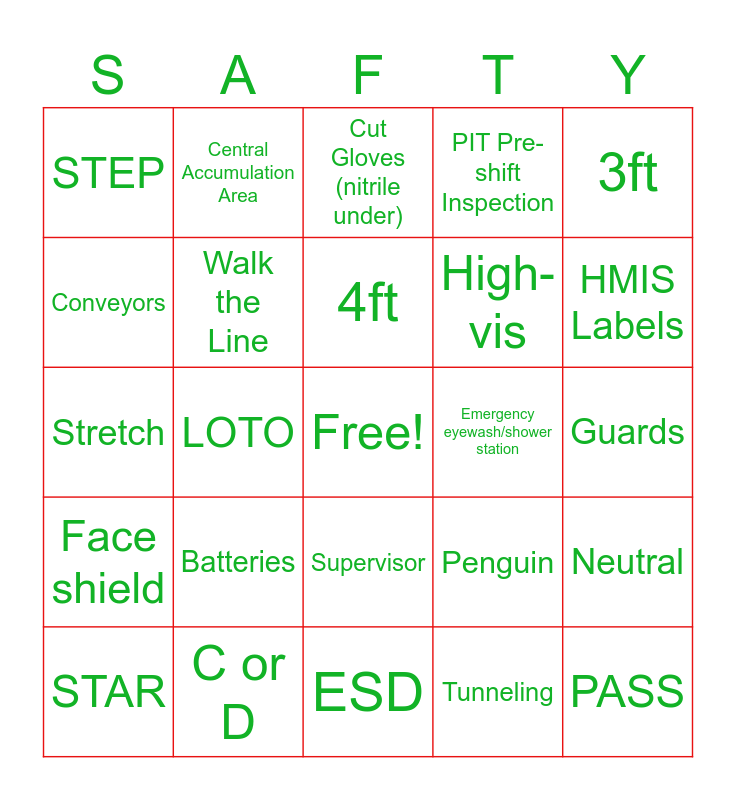 This bingo card has a free space and 34 words: Attended, Tunneling, ACP, Slice Brand Knives, Face shield, Walk the Line, 3ft, STAR, Central Accumulation Area, First Responder, 4ft, Cut Gloves (nitrile under), Entanglement, Hazardous, Emergency eyewash/shower station, HMIS Labels, C or D, Stretch, Batteries, Penguin, Supervisor, Hot Work Permit, STEP, Guards, ESD, PASS, PIT Pre-shift Inspection, Plastic, High-vis, Conveyors, Bonding and Grounding, LOTO, Neutral and Drum.
