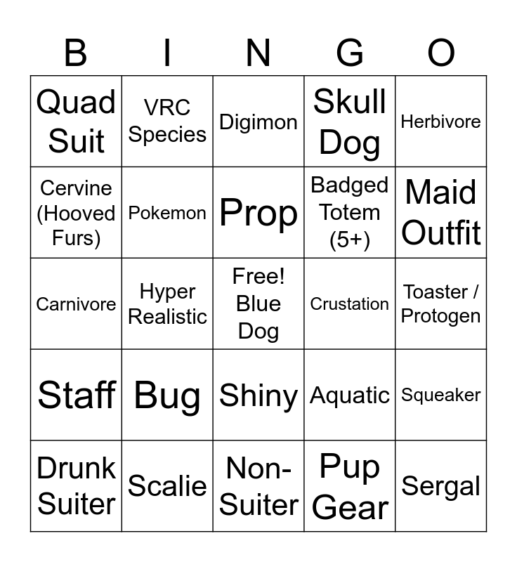 This bingo card has a free space and 29 words: Drunk Suiter, Dancing Suiter, Hyper Realistic, Dino Mask, Quad Suit, Digimon, Pokemon, Bug, Crustation, Scalie, Toaster / Protogen, Sergal, Non-Suiter, Pup Gear, Maid Outfit, Sponsor, Shiny, Staff, Herbivore, Carnivore, Aquatic, Wickerbeast, Badged Totem (5+), Cervine (Hooved Furs), Skull Dog, VRC Species, Squeaker, Prop and Hate Group.