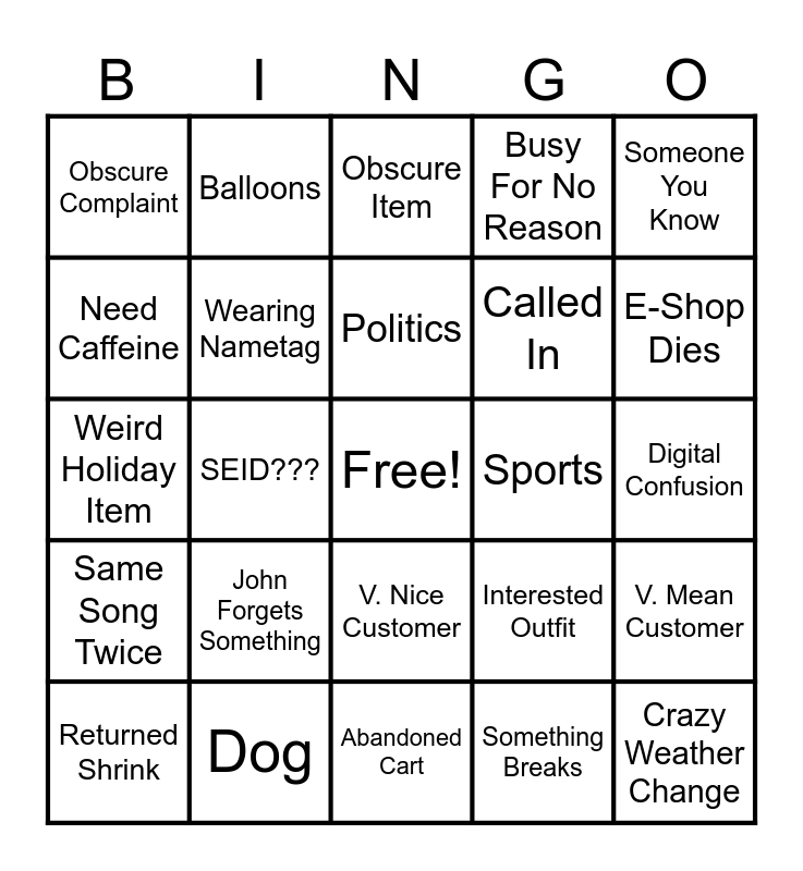 This bingo card has a free space and 24 words: John Forgets Something, Dog, Politics, Returned Shrink, Someone You Know, Obscure Complaint, Need Caffeine, Balloons, Sports, V. Nice Customer, Called In, Weird Holiday Item, Interested Outfit, V. Mean Customer, Wearing Nametag, Something Breaks, Digital Confusion, Obscure Item, E-Shop Dies, SEID???, Crazy Weather Change, Same Song Twice, Busy For No Reason and Abandoned Cart.
