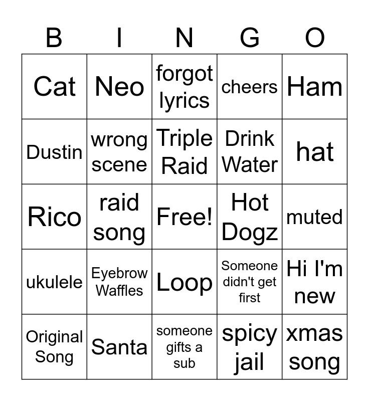 This bingo card has a free space and 24 words: Eyebrow Waffles, Santa, Triple Raid, Original Song, Ham, Cat, Dustin, Neo, Hot Dogz, Loop, Drink Water, Rico, Someone didn't get first, Hi I'm new, wrong scene, spicy jail, muted, forgot lyrics, hat, raid song, xmas song, ukulele, cheers and someone gifts a sub.