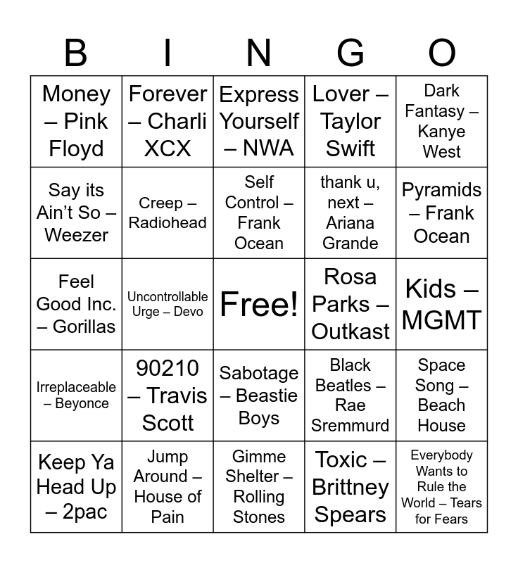 This bingo card has a free space and 86 words: Billy Jean – Michael Jackson, Paper Planes – M.I.A., Sabotage – Beastie Boys, Hey Ya! – Outkast, Dancing Queen – ABBA, What’s Going On – Marvin Gaye, Heart Shaped Box – Nirvana, Superstition – Stevie Wonder, Doo Wop (That Thing) – Lauryn Hill, Dreams – Fleetwood Mac, Baba O’Riley – The Who, It Was a Good Day – Ice Cube, Space Song – Beach House, Kids – MGMT, Where is My Mind – Pixies, Self Control – Frank Ocean, Respect – Aretha Franklin, Tongue Tied – Group Love, Dancing in the Dark – Bruce Springsteen, Don’t Stop me now – Queen, Sk8er Boi – Avril Lavigne, Heart of Glass – Blondie, Feel Good Inc. – Gorillas, Good Vibrations – Beach Boys, Toxic – Brittney Spears, Take on me – AHA, Space Oddity – David Bowie, The Bigger Picture – Lil Baby, Shook Ones Pt II – Mobb Depp, Black Hole Sun – Soundgarden, Jump Around – House of Pain, Blitzkrieg Bop – Ramones, Here Comes Your Man – Pixies, 90210 – Travis Scott, Say its Ain’t So – Weezer, No Role Modelz – J Cole, Pyramids – Frank Ocean, Shoota – Playboi Carti, Good Times Bad Times – Led Zeppelin, Uncontrollable Urge – Devo, NEW MAGIC WAND – Tyler the Creator, Paranoid – Black Sabbath, Just Like Heaven – The Cure, Rosa Parks – Outkast, ALL CAPS – MF DOOM, Dark Fantasy – Kanye West, Money Trees – Kendrick Lamar, Forever – Charli XCX, Cigarette Daydreams – Cage the Elephant, White Iverson – Post Malone, Motion Sickness – Phoebe Bridgers, Love on the Brain – Rihanna, Irreplaceable – Beyonce, Lucy In the Sky with Diamonds – The Beatles, Maps – Yeah Yeah Yeahs, Don’t Start Now – Dua Lipa, Good 4 U – Olivia Rodrigo, thank u, next – Ariana Grande, Lover – Taylor Swift, Creep – Radiohead, Money – Pink Floyd, Say so – Doja Cat, Once in a lifetime – Talking Heads, 3 little birds -- Bob Marley, Sittin on the Dock of the bay – Otis Reading, Express Yourself – NWA, Float on – Modest Mouse, Everybody Wants to Rule the World – Tears for Fears, Run Away With Me – Carly Rae Jepsen, Hold On, We’re Going Home – Drake, Dior – Pop Smoke, Would – Alice in Chains, Keep Ya Head Up – 2pac, Superfly – Curtis Mayfield, Hypnotize – Biggie Smalls, Love Will Tear Us Apart – Joy Division, Gimme Shelter – Rolling Stones, Ballroom Blitz – Sweet, Leave the Door Open – Silk Sonic (Bruno Mars & Anderson .Paak), September – Earth, Wind & Fire, Redbone – Childish Gambino, Love Galore – SZA, Blinding Lights – The Weeknd, Thinkin Bout You – Frank Ocean, Black Beatles – Rae Sremmurd and Mr. Rager – Kid Cudi.