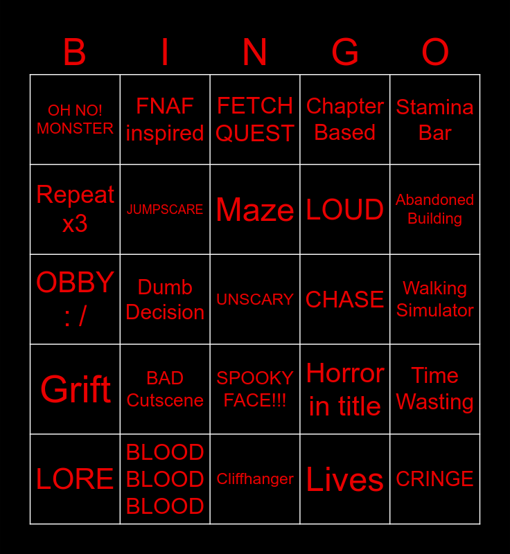 This bingo card has a free space and 24 words: BAD Cutscene, BLOOD BLOOD BLOOD, Maze, LORE, Stamina Bar, OH NO! MONSTER, Repeat x3, FNAF inspired, CHASE, SPOOKY FACE!!!, LOUD, OBBY : /, Horror in title, Time Wasting, JUMPSCARE, Lives, Walking Simulator, FETCH QUEST, Abandoned Building, Dumb Decision, CRINGE, Grift, Chapter Based and Cliffhanger.