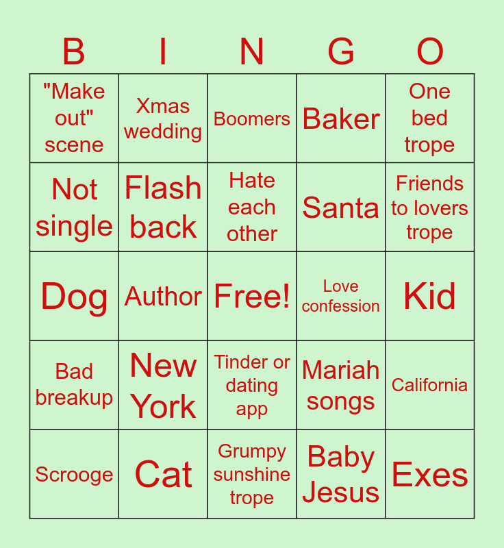 This bingo card has a free space and 37 words: Airport chase, Token gay, Flash forward, Flash back, California, New York, Hate each other, Fake dating, One bed trope, Big city/small town, Author, Baker, Exes, Kid, Not single, Bad breakup, Trip 'home', Boomers, Tinder or dating app, Love confession, "Make out" scene, Friends to lovers trope, Scrooge, Grumpy sunshine trope, Mistletoe, Baby Jesus, Xmas wedding, Royalty, Famous Cameo, Love Actually reference, NYE, Cat, Dog, Chills walkaway, Mariah songs, Santa and Big family.