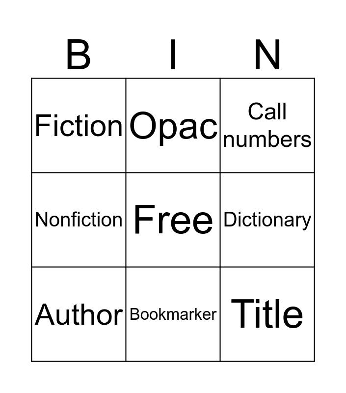 This bingo card has a free space and 8 words: Dictionary, Call numbers, Opac, Author, Fiction, Title, Nonfiction and Bookmarker.